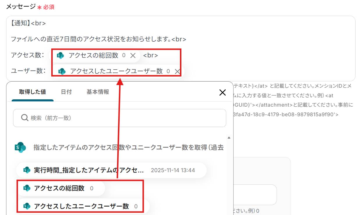 メッセージ内容は、固定値と取得した値を組み合わせて設定しました。 赤枠が取得した値を引用した箇所です。 取得した値を利用することで、トリガーが起動するたびに最新の内容を自動で引用できます。