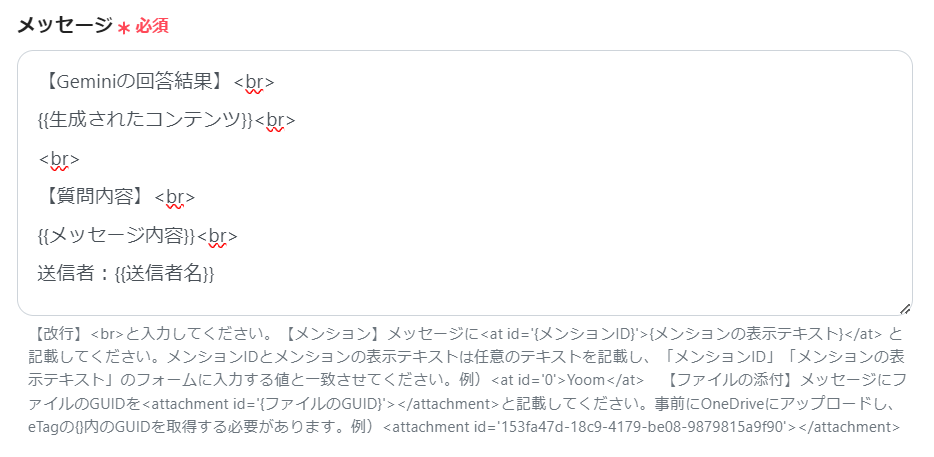 {{メッセージ内容}}の設定方法は以下の通りです。
