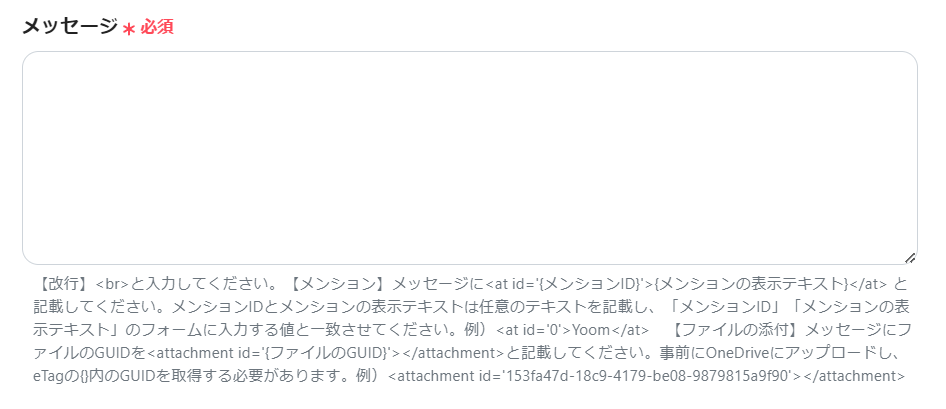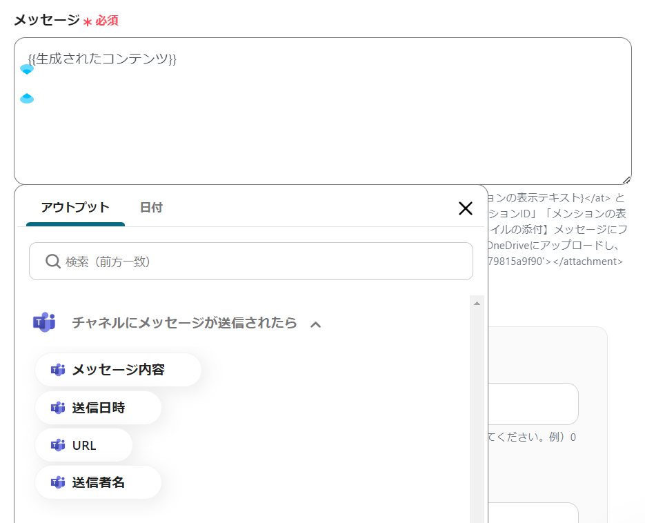 赤枠部分の{{メッセージ内容}}=Microsoft Teamsに投稿されたメッセージとなります。