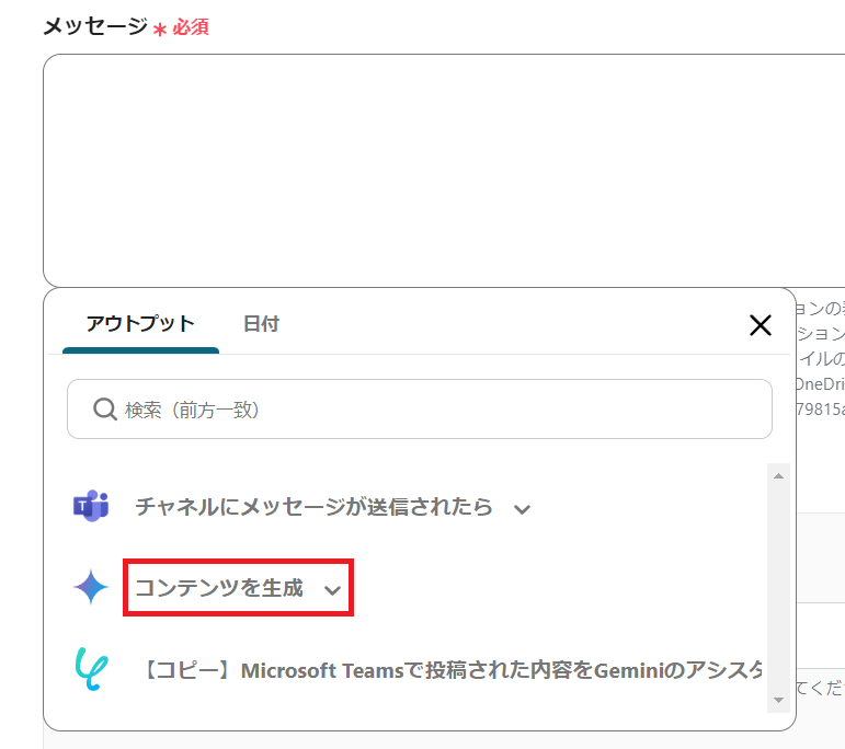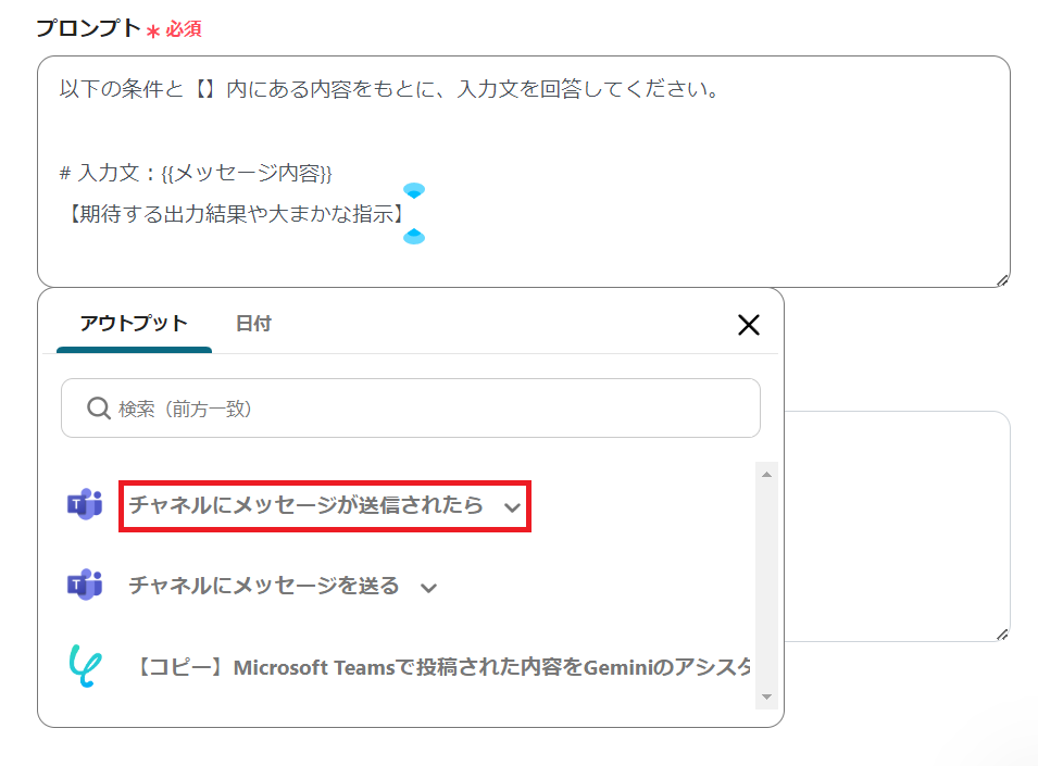 Geminiの検索結果をMicrosoft Teamsへ投稿する際の内容を設定します。