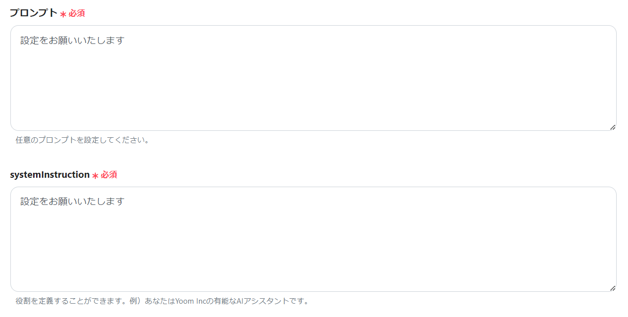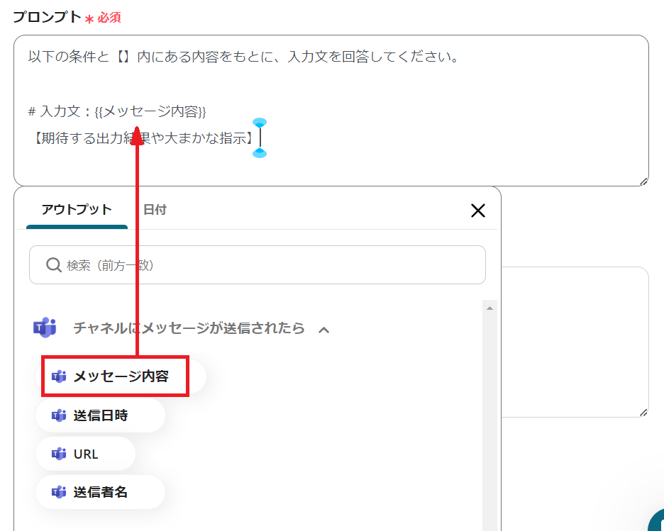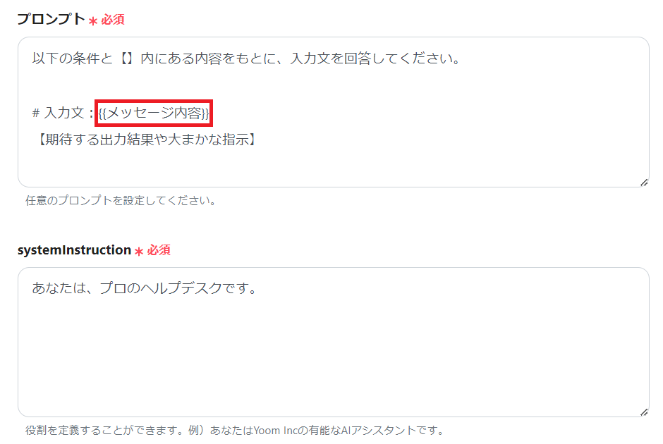 プロンプトの内容は任意で設定可能となりますが、ボックスに{{メッセージ内容}}の挿入は必ず行いましょう。
