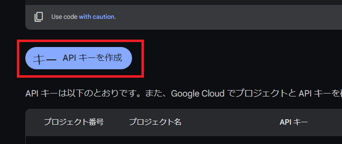 APIキーが作成されました。赤枠の部分に表示されているため、コピーをしましょう。