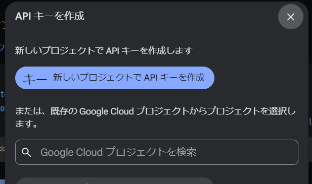 続けて「新しいプロジェクトでAPIキーを作成」を押します。