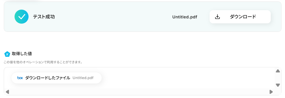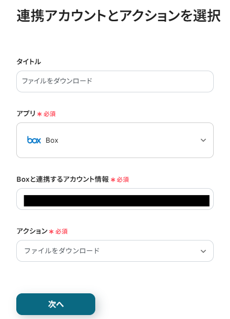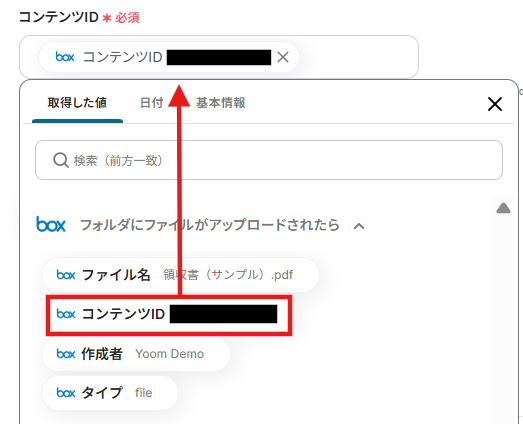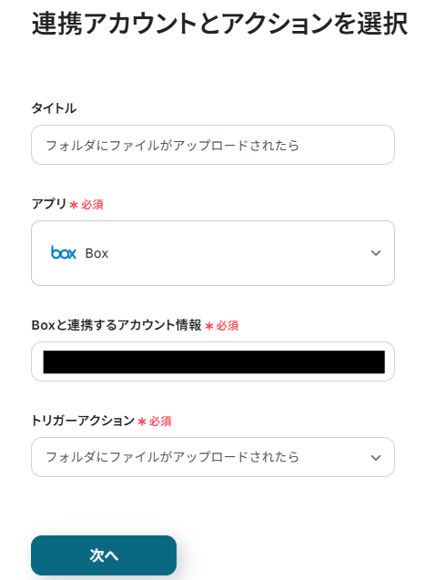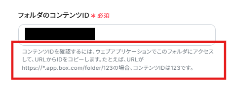 Google Driveでファイルの一覧を取得するアクションで、対象としたいフォルダのIDを任意で設定してください。 Boxにファイルをアップロードするアクションで、ファイルを格納したいフォルダのパスを任意で設定してください。