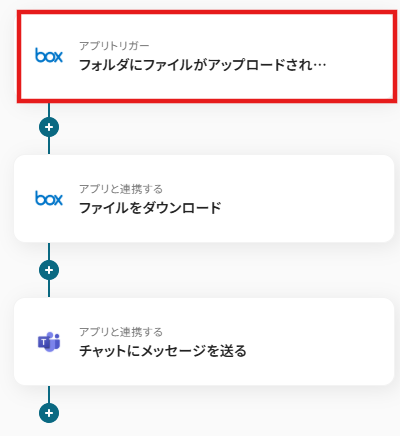 BoxとMicrosoft TeamsをYoomと連携します。 トリガーでBoxの「フォルダにファイルがアップロードされたら」というトリガーアクションを設定し、対象のフォルダを指定します。 オペレーションでBoxの「ファイルをダウンロード」アクションを設定し、トリガーで検知したファイルをダウンロードします。 オペレーションでOCR機能を選択し「任意の画像やPDFを読み取る」アクションでダウンロードしたファイルを読み取ります。 オペレーションでMicrosoft Teamsの「チャネルにメッセージを送る」を設定し、OCRで抽出したテキストをメッセージ本文に含めて送信します。 ※「トリガー」:フロー起動のきっかけとなるアクション、「オペレーション」:トリガー起動後、フロー内で処理を行うアクション