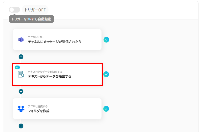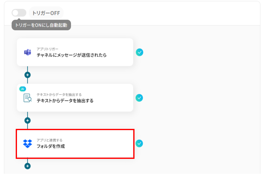 Microsoft Teamsで投稿されたメッセージから内容を自動的に検出し、DropboxやBoxといったストレージサービスにフォルダを作成するフローです。手動での手間を省き、業務全体の効率化が期待できます!