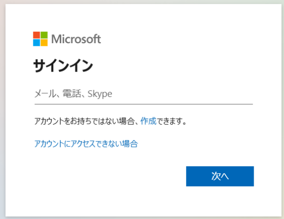 2.サインインをする Microsoftのメールアドレスまたは電話番号を入力し次へをクリックします。 画面が遷移し、パスワード入力画面となります。パスワードを入力してサインインをクリックしてください。