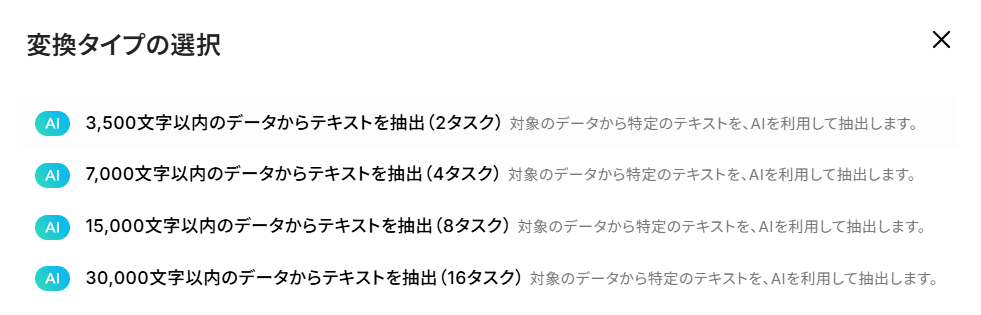 2.アクションを選択 ここでは、テキストの変換タイプを選択できます。 タイトルは、任意で編集可能です。 変換タイプは、デフォルトで「3,500文字以内のデータからテキストを抽出(2タスク)」が選択されています。文字数やタスク数に合わせて、変更可能です。 選択できたら、「次へ」を押して進みましょう。