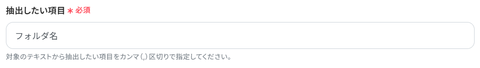 抽出したい項目:対象のテキストから抽出したい項目を設定します。 今回は、「フォルダ名」を抽出したいので下記のように設定しました。 なお、複数の項目を設定することも可能ですので、必要に応じてカンマ(,)区切りで設定しましょう。