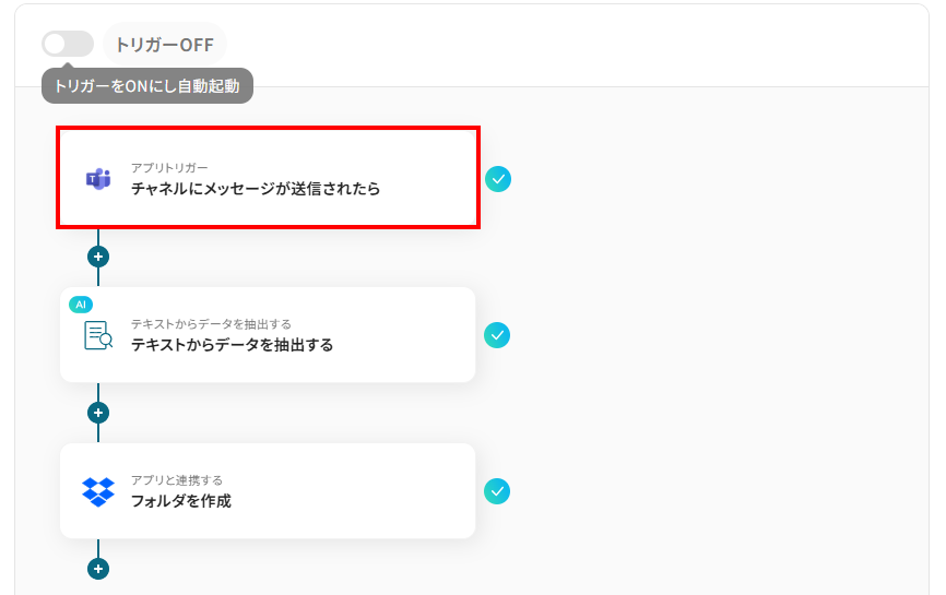 今回はMicrosoft Teamsで投稿された内容をもとに、Dropboxにフォルダを作成するフローボットを作成していきます! 作成の流れは大きく分けて以下です。