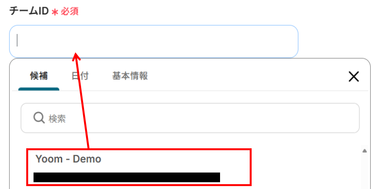 チームID:入力欄をクリックすると、下記のような候補が表示されます。先ほど作成したMicrosoft Teamsのチームを選択してください。