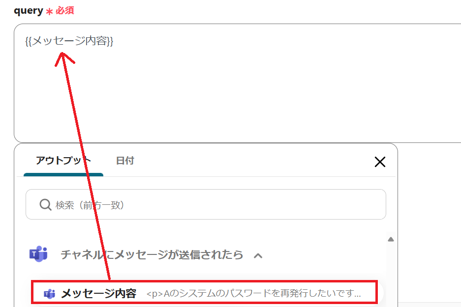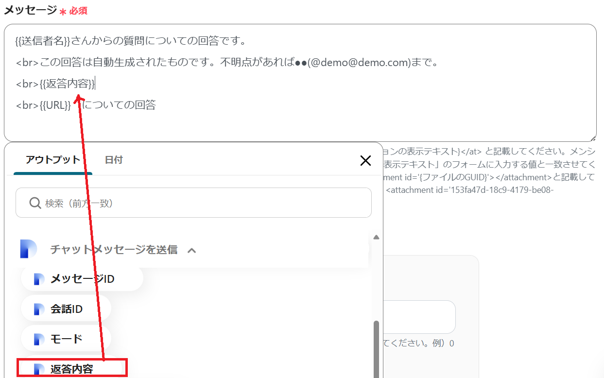 メッセージ内容にはアウトプットを埋め込みます。