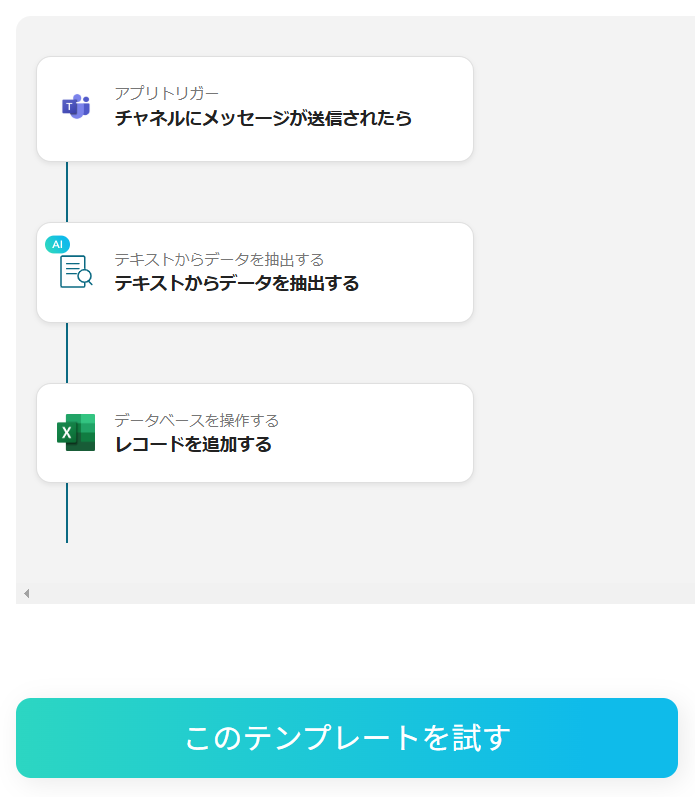 Microsoft Teamsでメッセージが送信されたら、投稿内容からAIでテキストを抽出してMicrosoft Excelに追加するフローです。 ■注意事項 ・Microsoft Teams、Microsoft ExcelのそれぞれとYoomを連携してください。 ・AIオペレーションはチームプラン・サクセスプランでのみご利用いただける機能となっております。フリープラン・ミニプランの場合は設定しているフローボットのオペレーションはエラーとなりますので、ご注意ください。 ・チームプランやサクセスプランなどの有料プランは、2週間の無料トライアルを行うことが可能です。無料トライアル中には制限対象のアプリやAI機能(オペレーション)を使用することができます。 ・Microsoft365(旧Office365)には、家庭向けプランと一般法人向けプラン(Microsoft365 Business)があり、一般法人向けプランに加入していない場合には認証に失敗する可能性があります。 ・トリガーは5分、10分、15分、30分、60分の間隔で起動間隔を選択できます。 ・プランによって最短の起動間隔が異なりますので、ご注意ください。 ・Microsoft Excelのデータベースを操作するオペレーションの設定に関しては、下記をご参照ください。 https://intercom.help/yoom/ja/articles/9003081