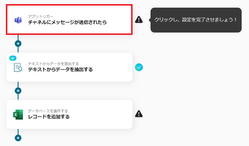 6.トリガーをONにすると、Microsoft Teamsで指定のチャネルにメッセージが送信されるたび、投稿内容から特定のテキストがAIで自動的に抽出され、Microsoft Excelに追加されます。