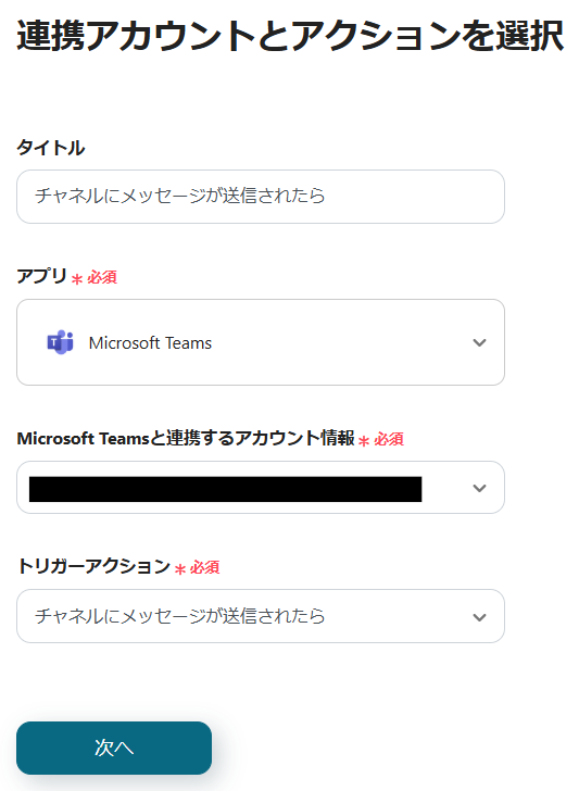 3.Microsoft Teamsと連携するアカウントを確認し、「次へ」をクリックします。 ※その他の項目はデフォルトで設定されています。