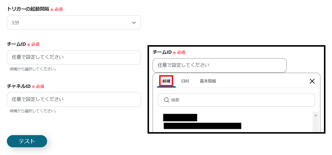 4.トリガーの起動間隔、チームID、チャネルIDを設定してテストを行います。 ※トリガーの起動間隔は5分、10分、15分、30分、60分が用意されており、プラン によって選択できる時間が変わります。選択した間隔ごとに一度、トリガーとなるアクションを確認し、実行された場合にフローボットが起動します。Microsoft Excelに内容をすぐ追加したいときは、短い間隔の設定がおすすめです。 ※チームIDとチャネルIDは、枠をクリックして表示される「候補」から設定できます。
