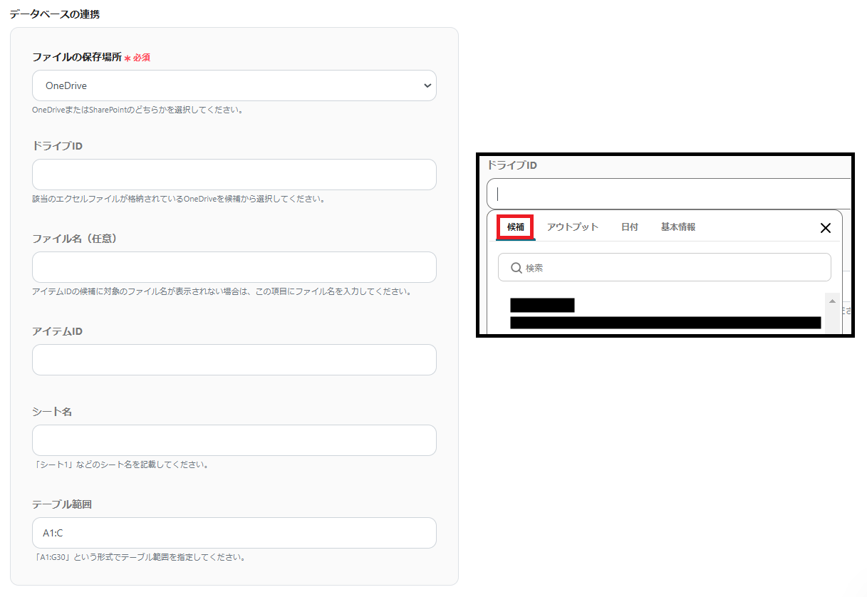 3.データベースの連携を設定します。 ※ドライブIDなどは、枠をクリックして表示される「候補」から設定できます。設定の詳細に関しては、こちら を確認してください。