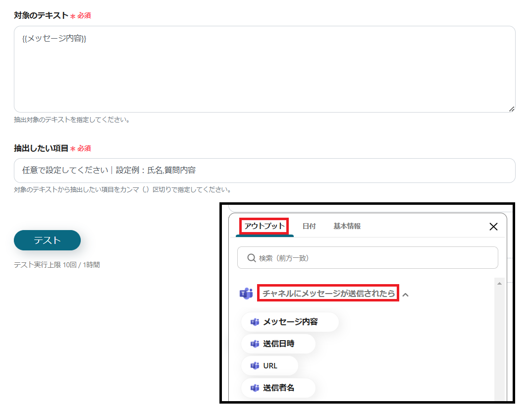3.対象のテキストと抽出したい項目を設定してテストを行います。 ※対象のテキストには、枠をクリックして表示されるアウトプットの「チャネルにメッセージが送信されたら」から抽出元になる値を設定します。(値は二重括弧で表示されます)これにより、投稿ごとに変わる値を動的に反映できます。