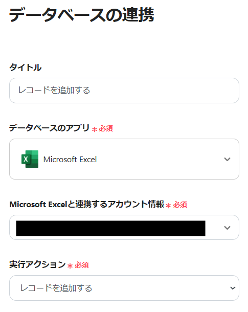 2.Microsoft Excelと連携するアカウントを確認します。 ※その他の項目はデフォルトで設定されています。