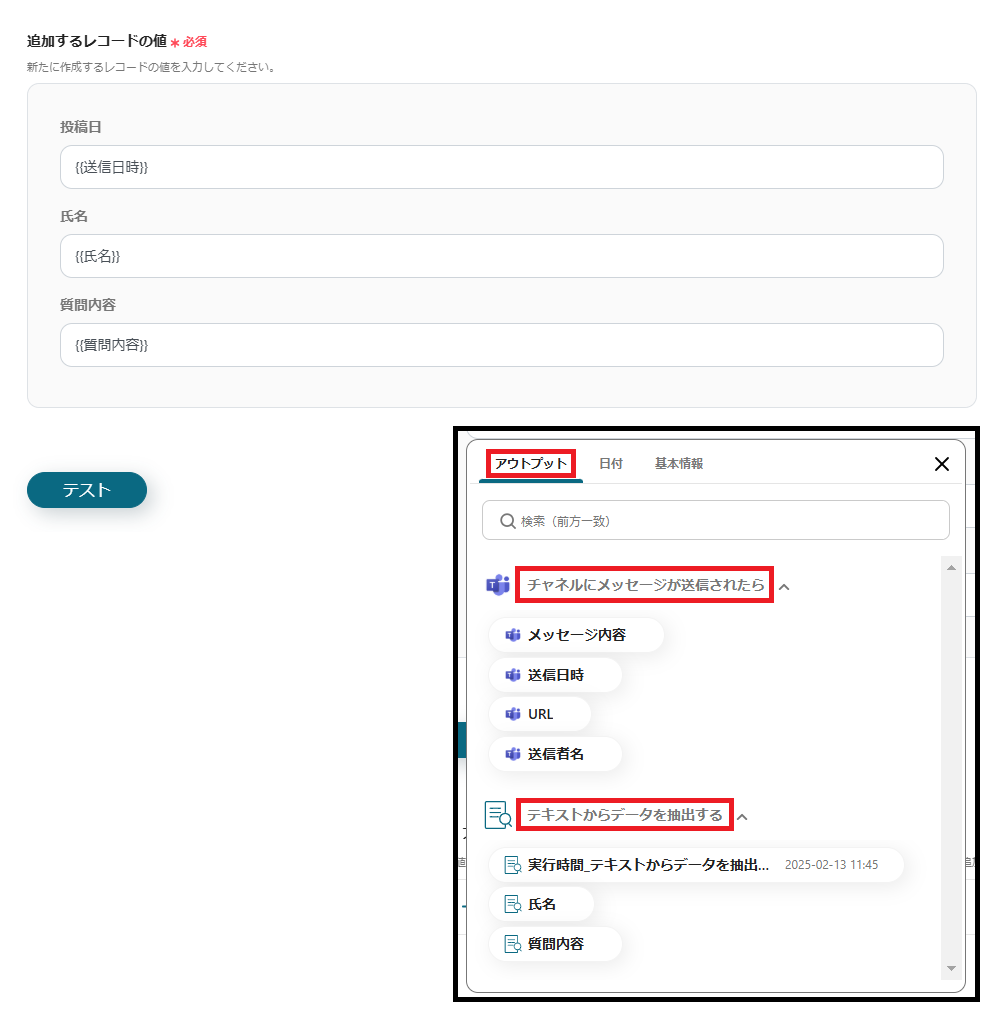 4.追加するレコードの値を設定してテストを行います。 ※Microsoft Teamsや抽出した値を反映させる項目は、枠をクリックして表示されるアウトプットの「チャネルにメッセージが送信されたら」や「テキストからデータを抽出する」から設定します。(値は二重括弧で表示されます)
