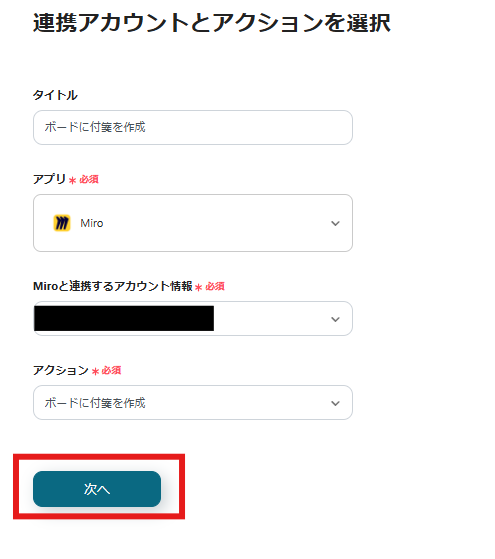 連携アカウントとアクションを選択の画面で、今回連携するMiroのアカウントで間違いないかを確認し、「次へ」をクリックします。