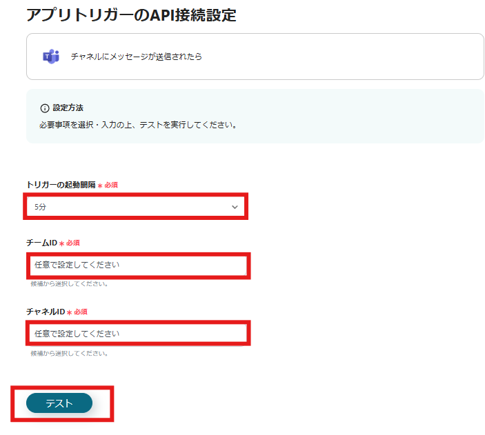 チームIDとチャネルIDは添付画像のように入力欄をクリックすると候補が表示されるので、その中から選んでください。
