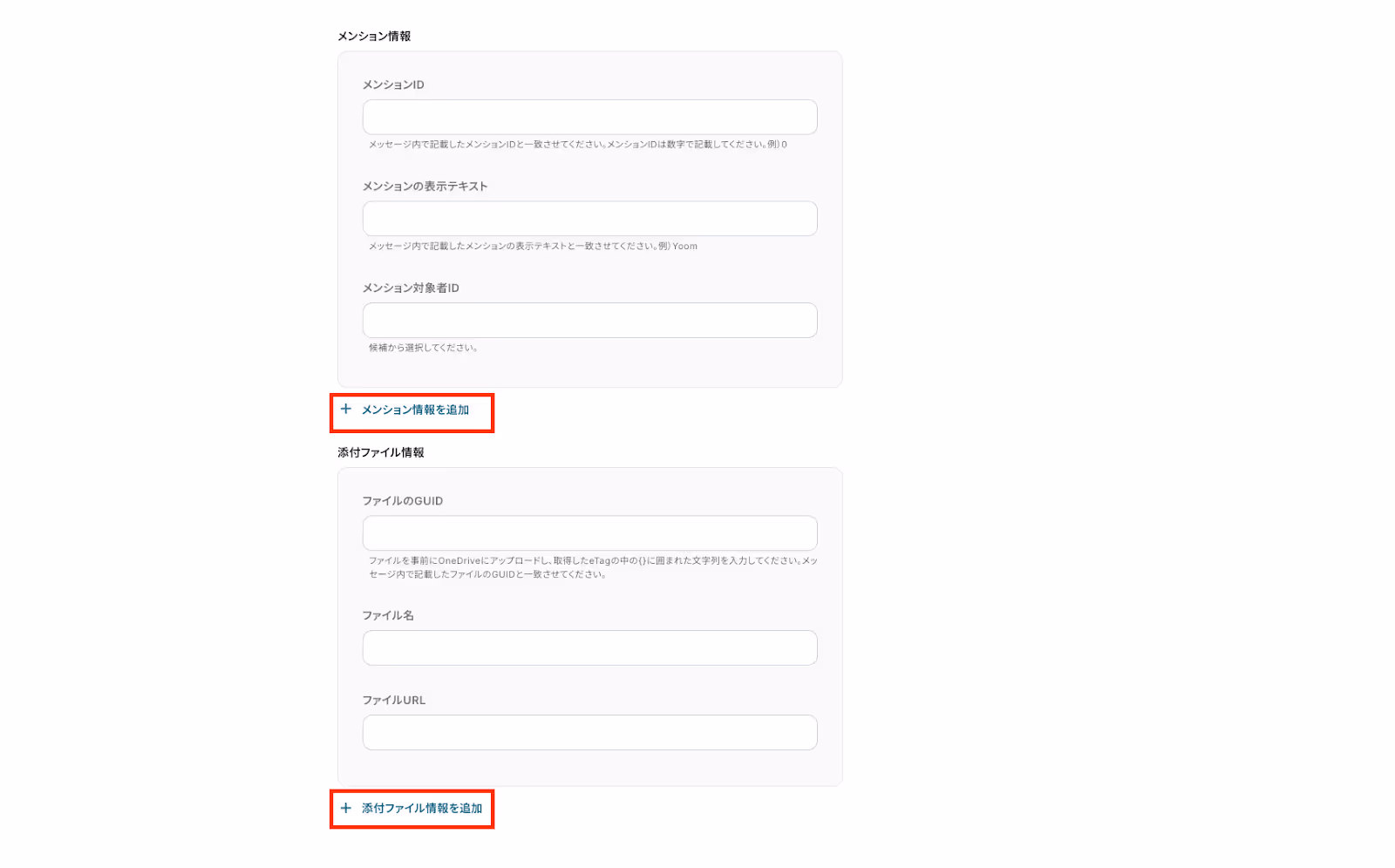 「メンション情報」や「添付ファイル情報」は、運用状況に合わせて設定してください。『+ 〇〇を追加』をクリックすると、設定項目を増やすことができます。