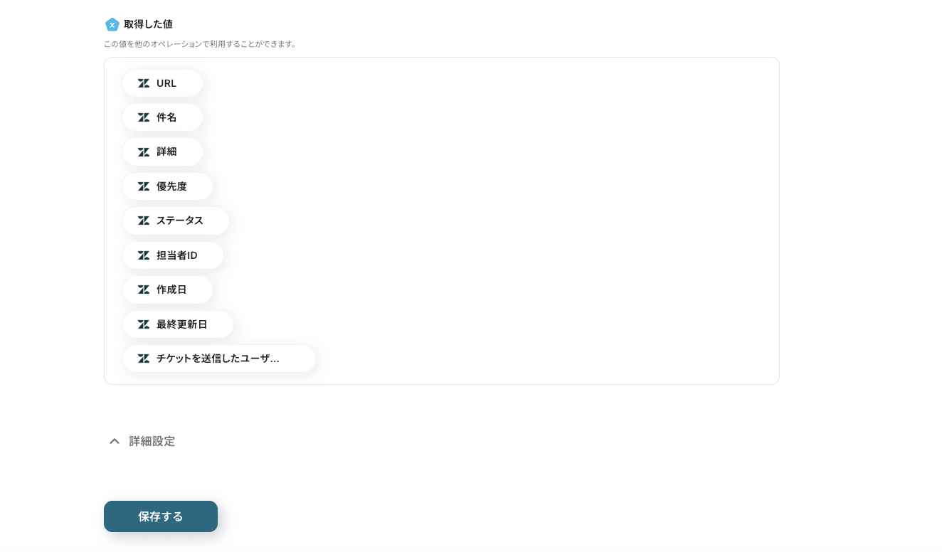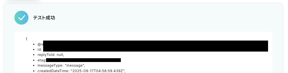 テスト完了を確認して『保存する』を押しましょう。 下記の取得した値 は、後続のアクションで変数として利用できます。 つまり、この後のMicrosoft Teamsの通知設定アクションでここの情報をそのまま引用することが可能となります。