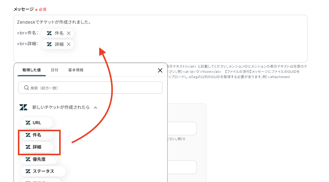 「メッセージ」には、通知内容に含めたい情報を入力してください。 入力バーをクリックすると、「取得した値」を引用できます。このように「取得した値」を引用することで、毎回異なる内容を通知できます 。 なお、「取得した値」を引用せず固定値を入力してしまうと、毎回同じ内容が通知されるのでご注意ください。 固定のテキストや「:」などの記号を使って、全体を見やすいように整えるのがおすすめです。