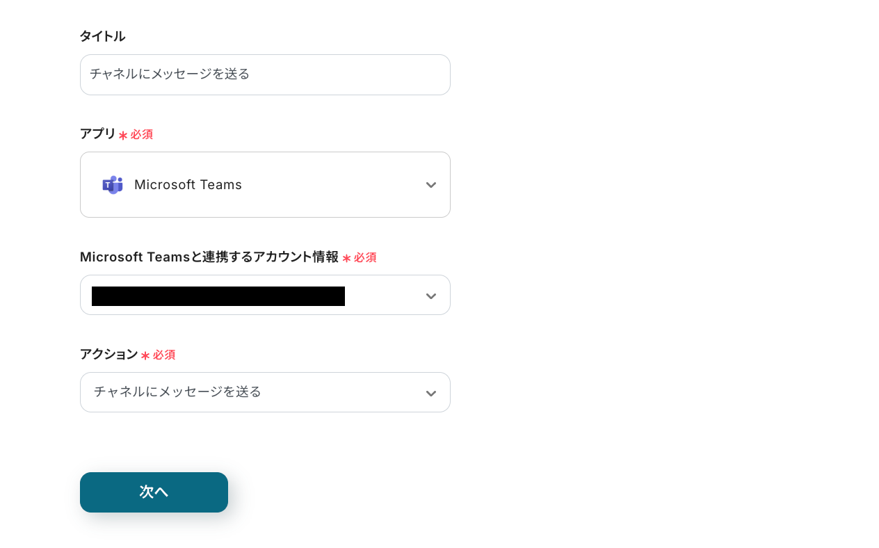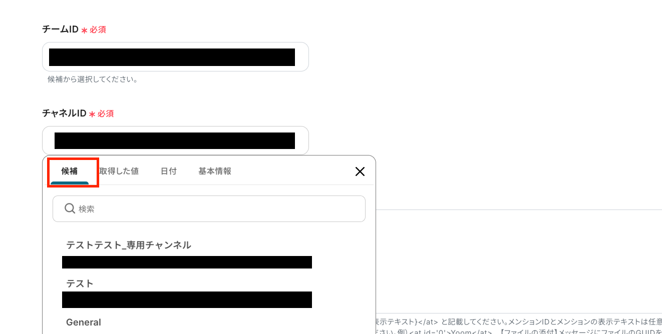 次の画面で「チームID」や「チャネルID」などの項目に情報を入力していきましょう。 入力バーをクリックすると、連携したアカウントに基づいた内容が『候補』として展開されますので、こちらから情報を選択できます。