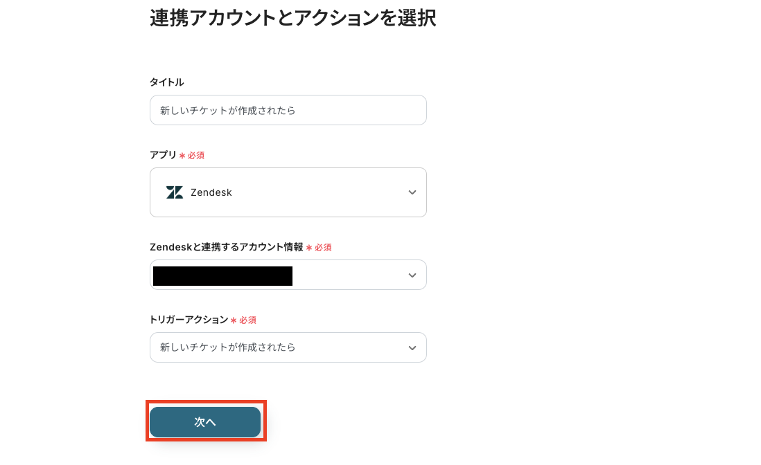 先ほど連携したアカウントが出てきますので、間違いないか確認します。 トリガーアクションはそのままに、次へ。