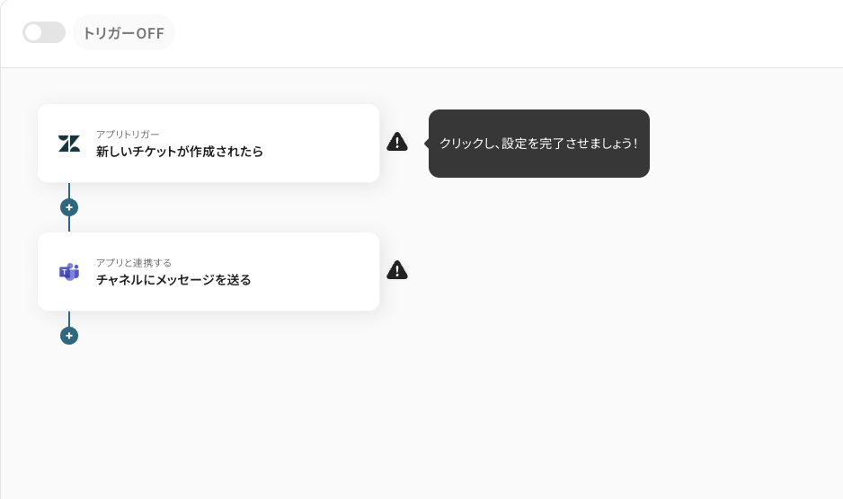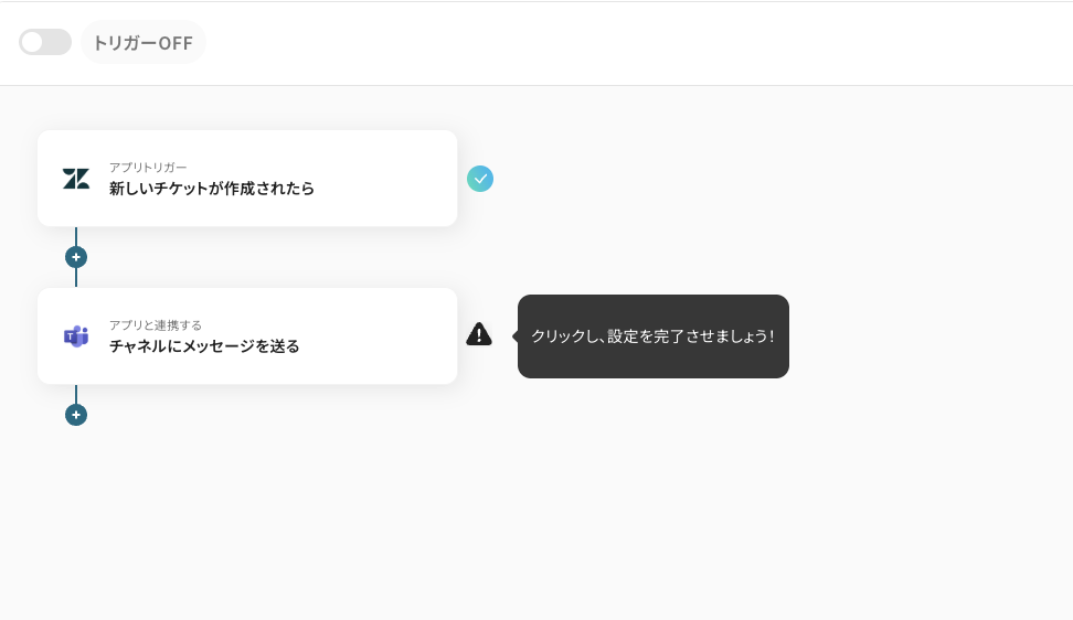 はじめに、ZendeskとMicrosoft TeamsをYoomに連携します。 次に、トリガーでZendeskを選択し、「新しいチケットが作成されたら」というアクションを設定します。 最後に、オペレーションでMicrosoft Teamsを選択し、「チャネルにメッセージを送る」アクションを設定することで、チケット情報を指定のチャネルに通知します。 ※「トリガー」:フロー起動のきっかけとなるアクション、「オペレーション」:トリガー起動後、フロー内で処理を行うアクション