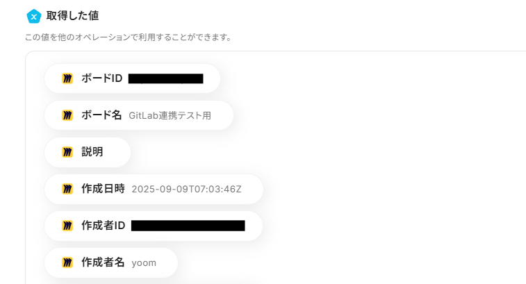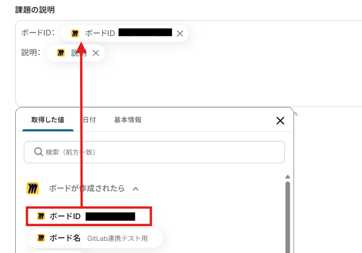 課題のタイトルは以下のようにMiroから取得した値を用いて「ボード名」を入力します。