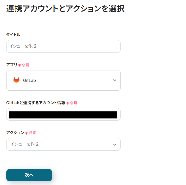 連携アカウントとアクションを選択する画面が表示されるので、今回連携するGitLabのアカウントを確認し「次へ」をクリックします。