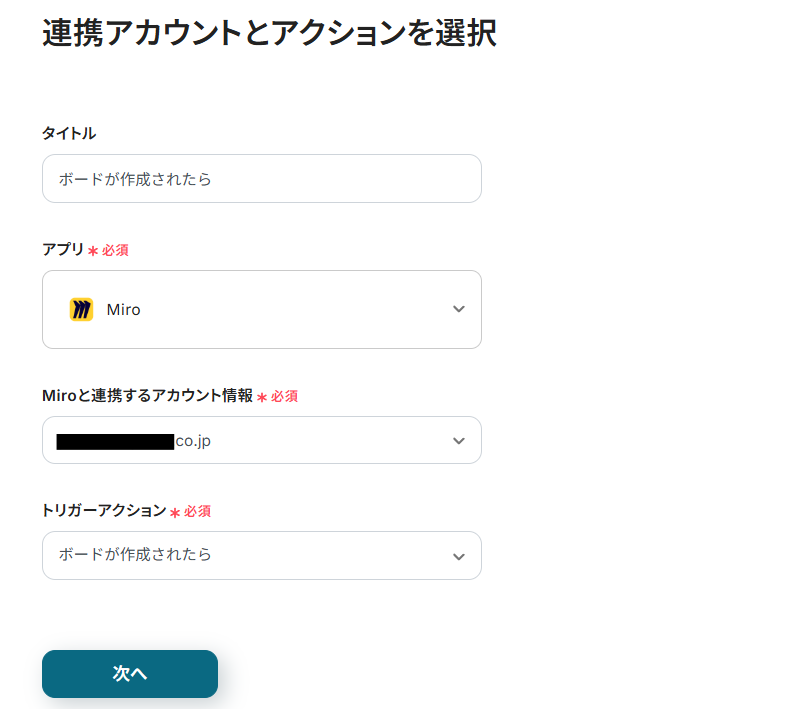 連携アカウントとアクションを選択する画面が表示されるので、今回連携するMiroのアカウントを確認し「次へ」をクリックします。