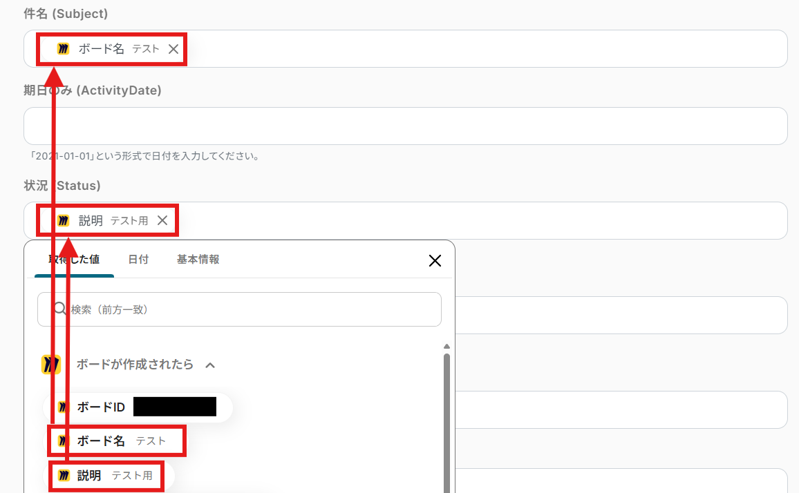 次に進んだら、各ボックスに連動する取得した値を入力していきましょう。