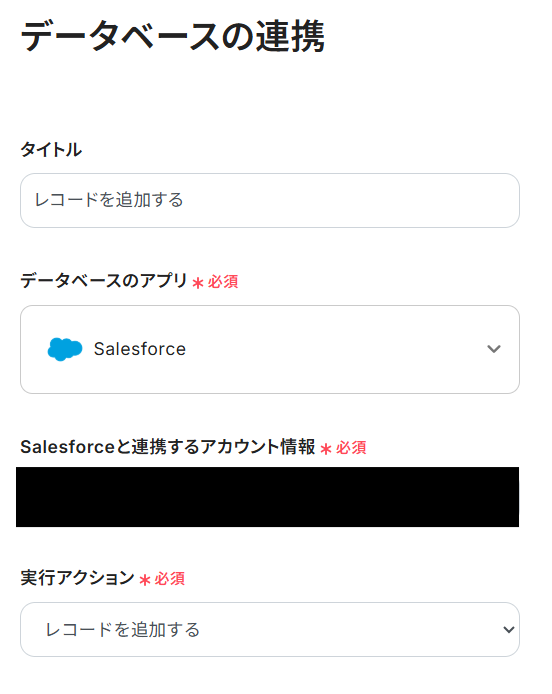 A:可能です!Salesforceの「レコードを追加する」アクションで、「追加するレコードの値」にカスタム項目が表示されます。表示されたカスタム項目に登録したい値を設定しましょう。