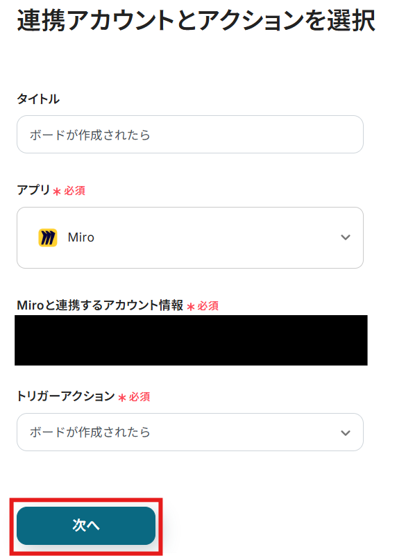 タイトルと連携するアカウント情報を確認し、アクションはテンプレート通りのまま「次へ」をクリックして進んでください。
