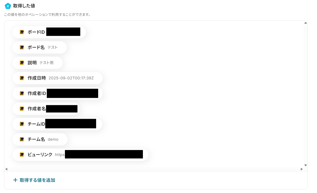 設定できたら「テスト」を行いましょう。テストが成功すると、取得した値が表示され、Miroのデータが確認できます。「保存する」をクリックして完了です!