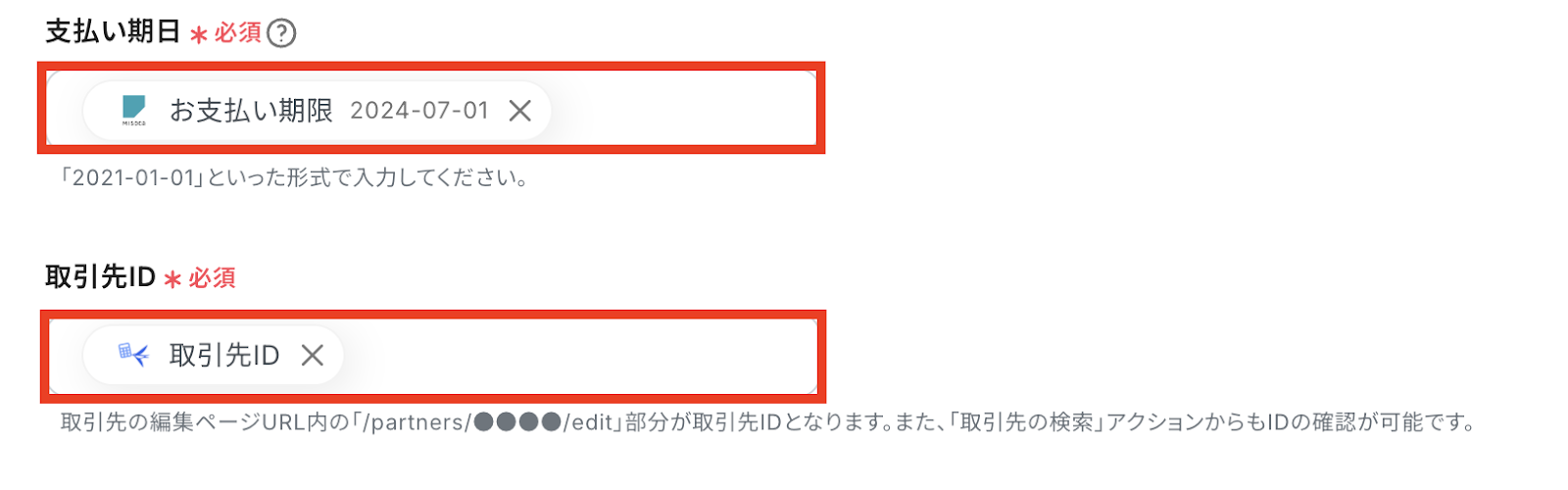 同じ手順で「支払い期日」や「取引先ID」も取得した値を活用して入力していきましょう。
