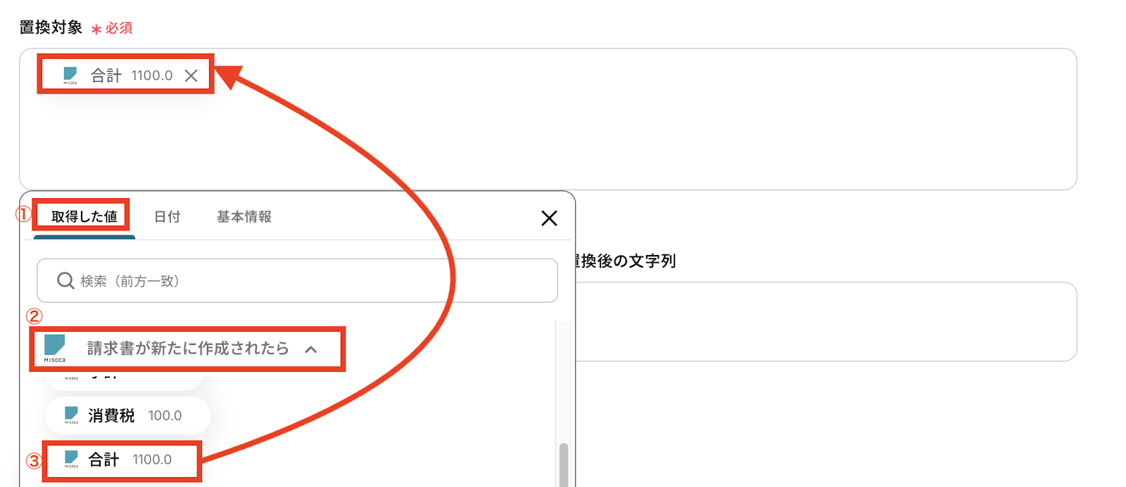次に「置換対象」としてステップ3で取得した値のうち「合計」を入力します。