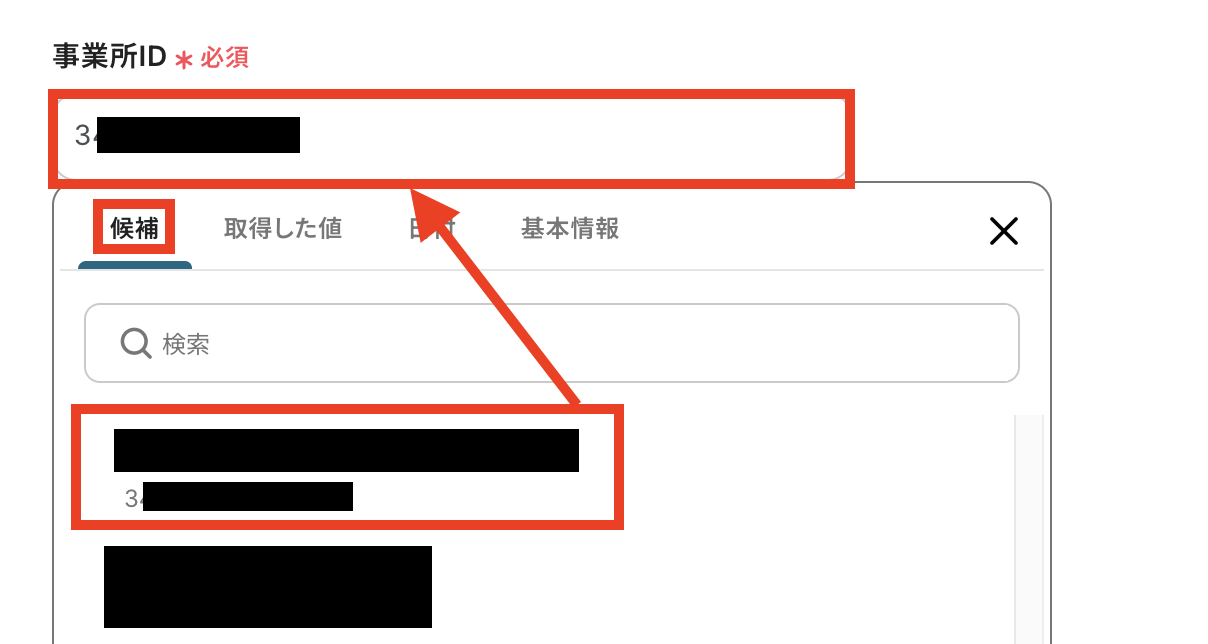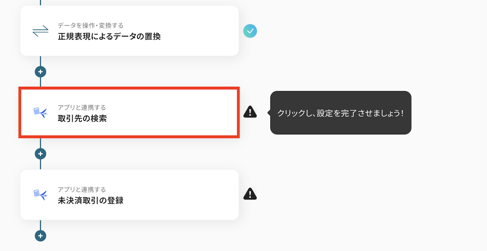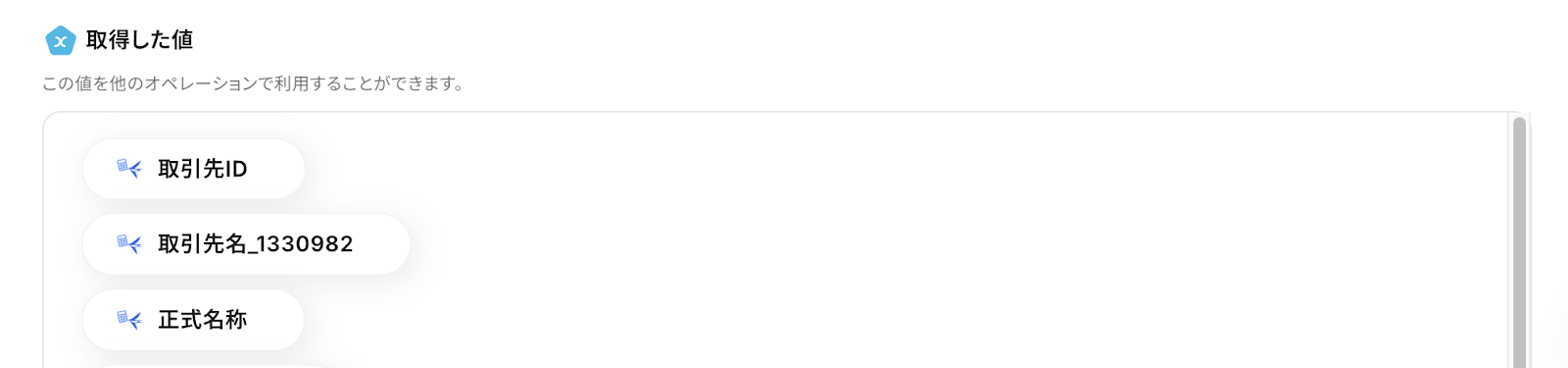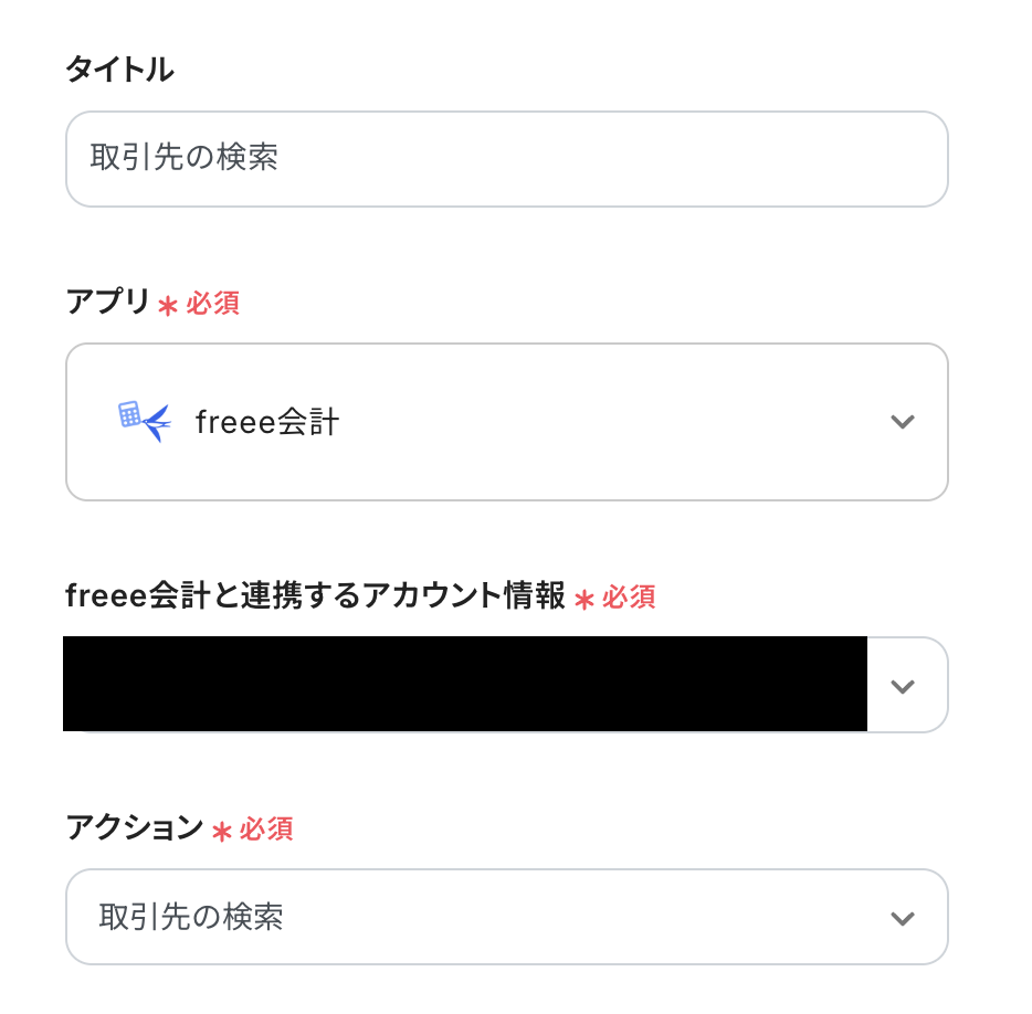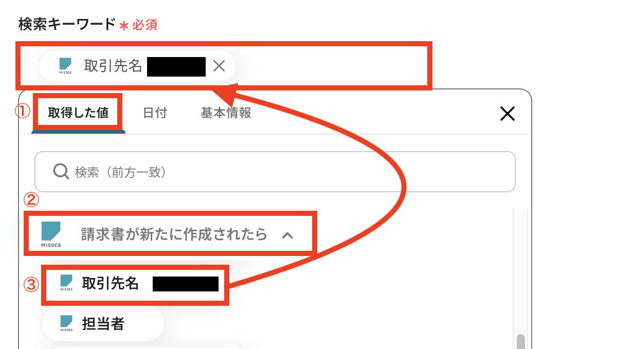 「検索キーワード」はステップ3で取得した値「取引先名」を入力します。