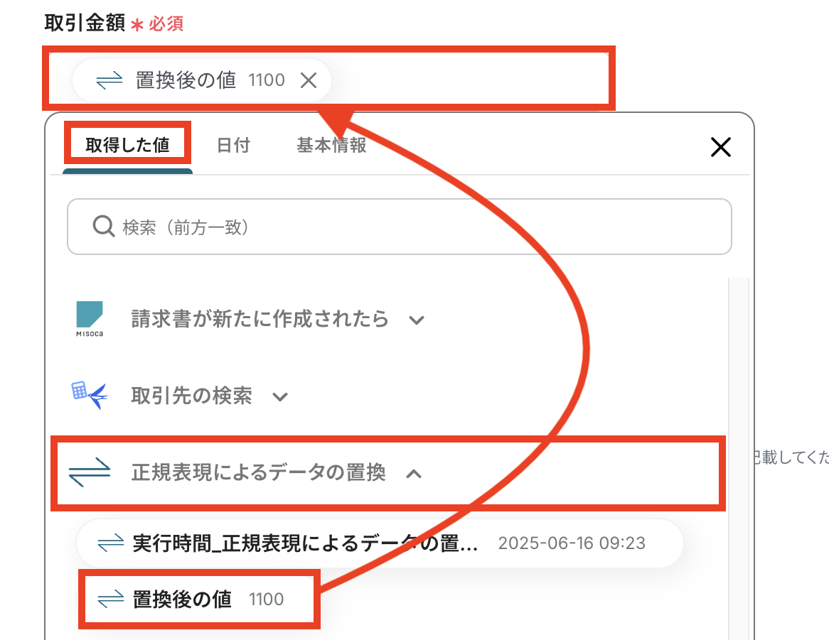 「取引金額」はステップ4で取得した置換後のデータを入力しましょう。