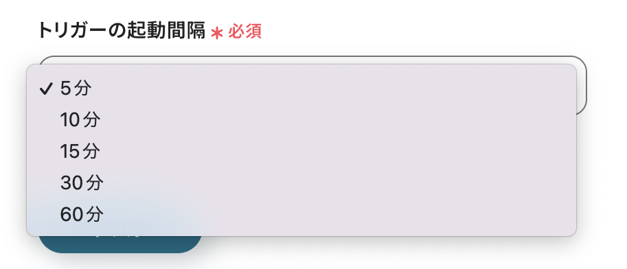 「トリガーの起動間隔」を5分・10分・15分・30分・60分から選択します。