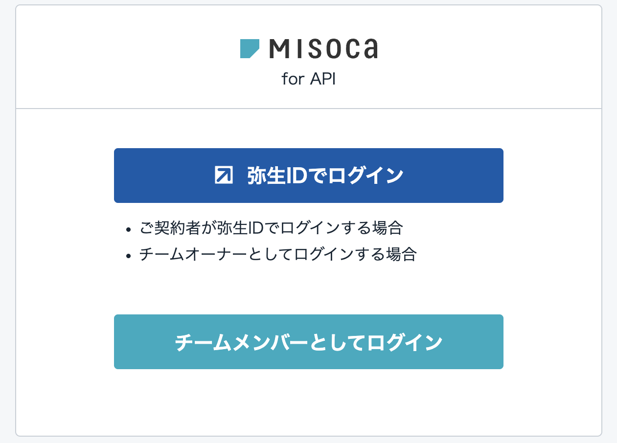 Misocaを検索するとログインページが表示されるので「弥生IDでログイン」か「チームメンバーとしてログイン」か選択し、ログイン情報を入力すれば連携完了です!