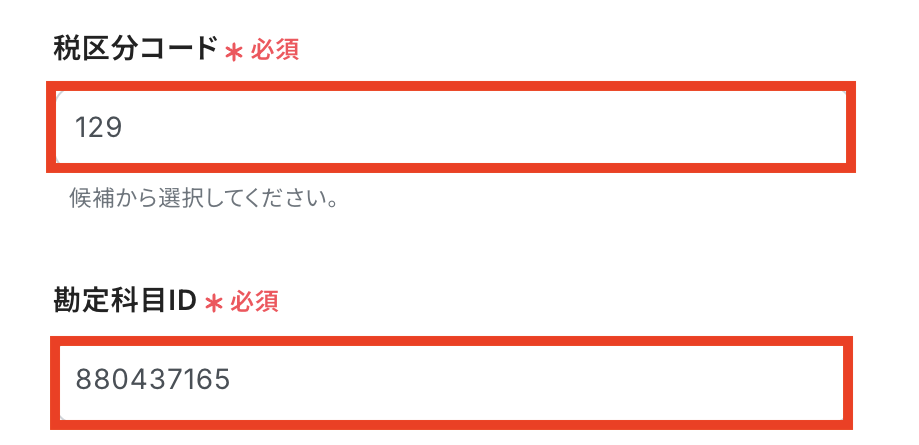 必須項目である「税区分コード」と「勘定科目ID」は候補から選択できます。