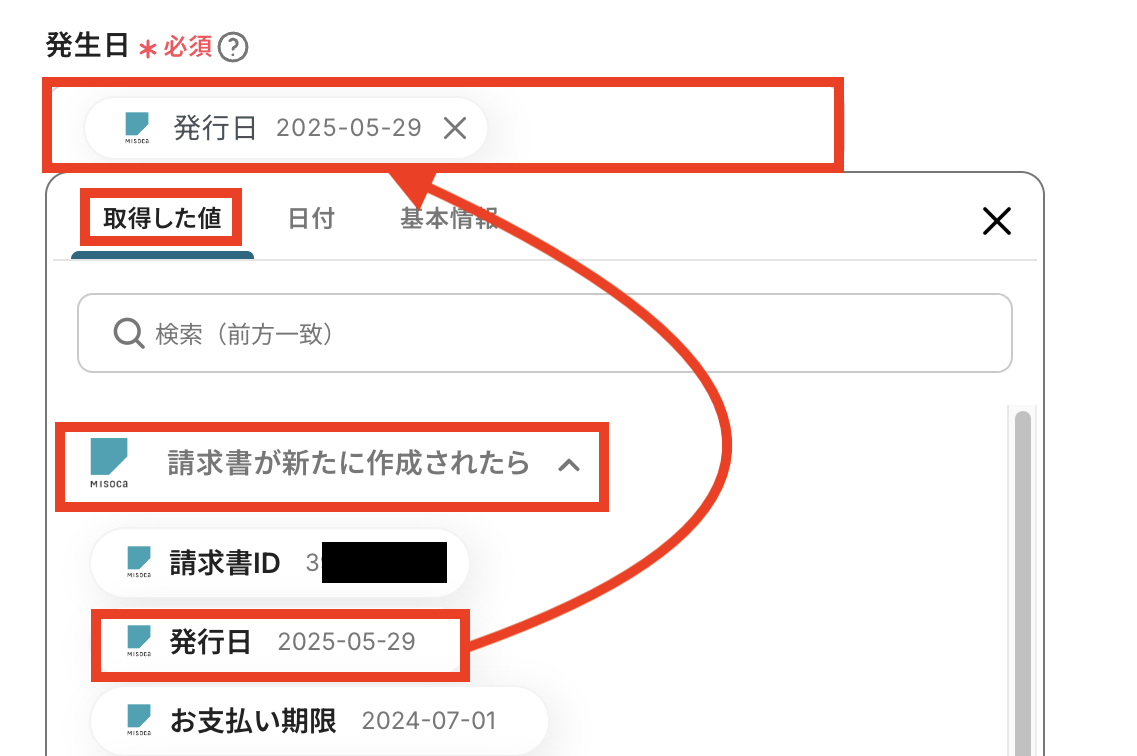 「発生日」はステップ3で取得した値「発行日」を入力します。