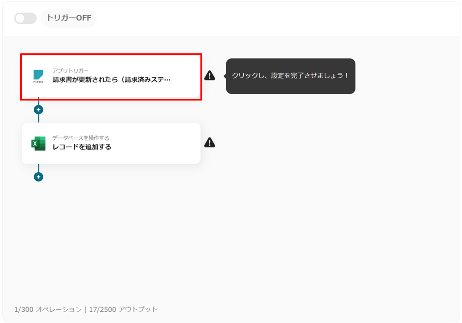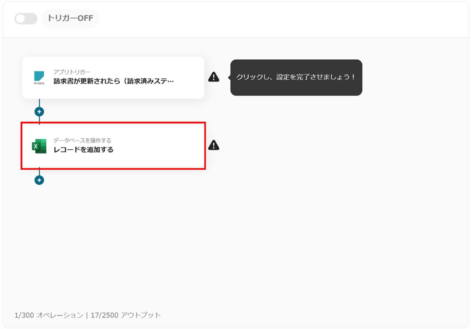 これで、「Misocaで請求書ステータスが請求済みになったらMicrosoft Excelに追加する」フローボットの完成です。