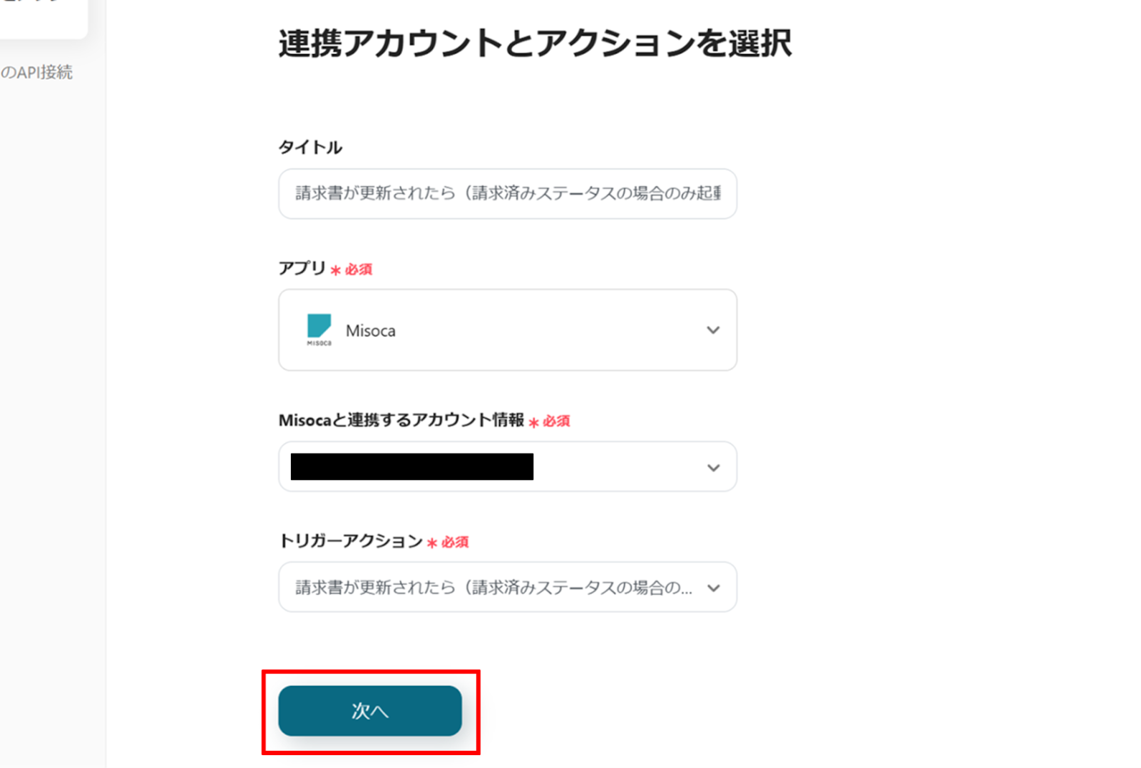 (2)Misocaの「連携アカウントとアクションを選択」画面から、Misocaと連携するアカウント情報に誤りがないかを確認し、トリガーアクションは「請求書が更新されたら(請求済みステータスの場合のみ起動)」のままで「次へ」をクリックします。