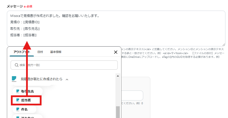 Misocaで見積書が作成されたされたことをMisocaのAPIを利用して受け取り、Microsoft Teamsの提供するAPIを用いてMicrosoft Teamsの指定のチャネルにMisocaで作成された見積書データを通知することで実現が可能です。